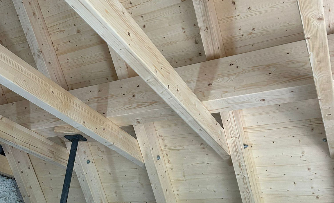 Nach der Vorbereitung der Konstruktion erfolgte die passgenaue Montage der tragenden Bauteile sowie der massiven Holzschalung. Die exakt zugeschnittenen und fachgerecht verlegten Holzplatten bilden eine robuste und langlebige Grundlage für den weiteren Dach- und Gebäudeaufbau.